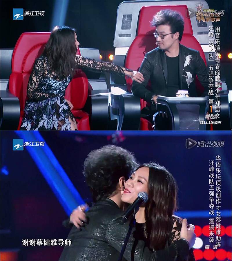 NO.5蔡健雅唱完歌曲,汪峰献抱抱。蔡健雅听学员郑迦文唱歌,就这样扯汪峰的袖子。小编很想知道你们这么亲密,子怡知道吗?