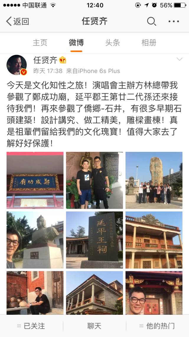 结束了妈祖祖庙的祈福后任贤齐在12.31泉州跨年演唱会的主办方林一雷先生的带领下开启了泉州的文化之旅。