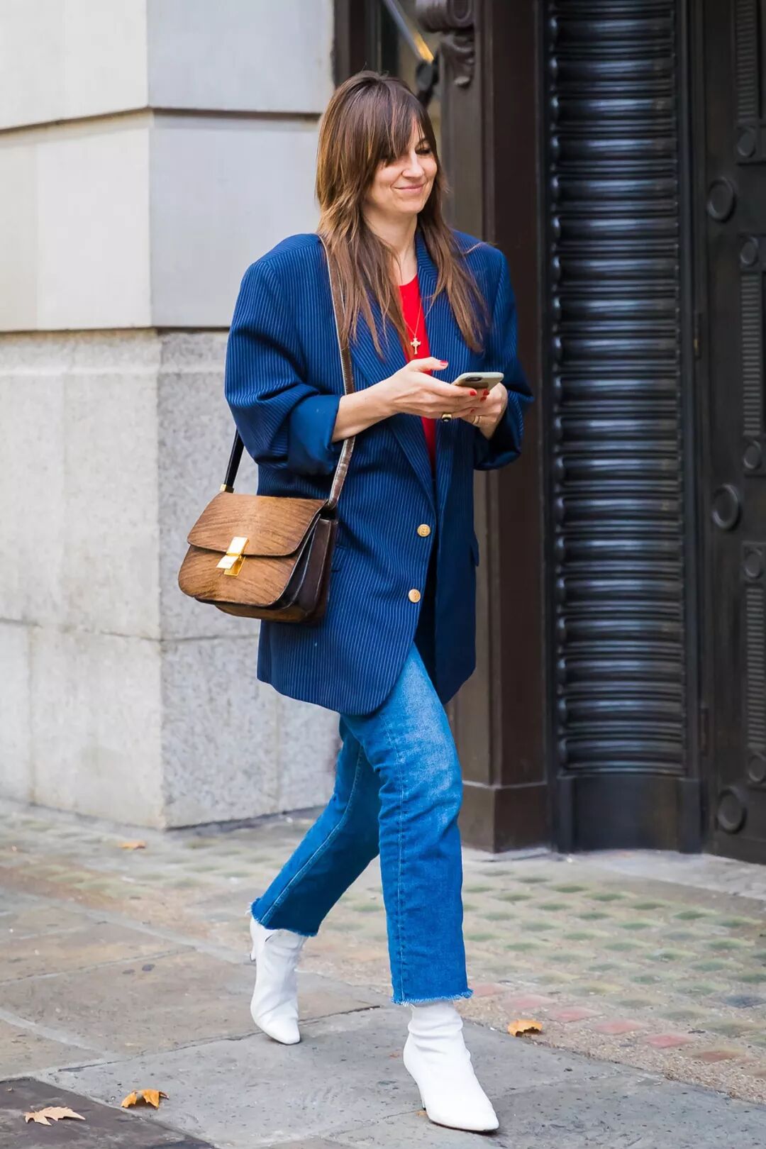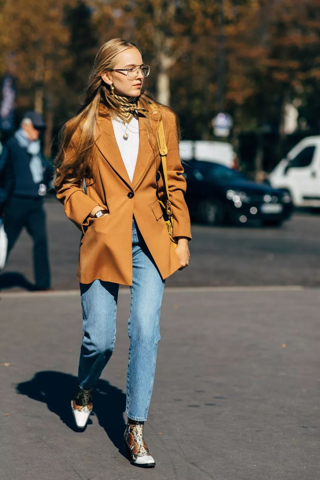 牛仔裤也能削弱西装的Power,但它毕竟是带着男孩子气的单品,不想真穿成一个Boy,你需要尖头靴、丝巾、别致的耳环与项链这些精美的细节来提升优雅“女子力”。