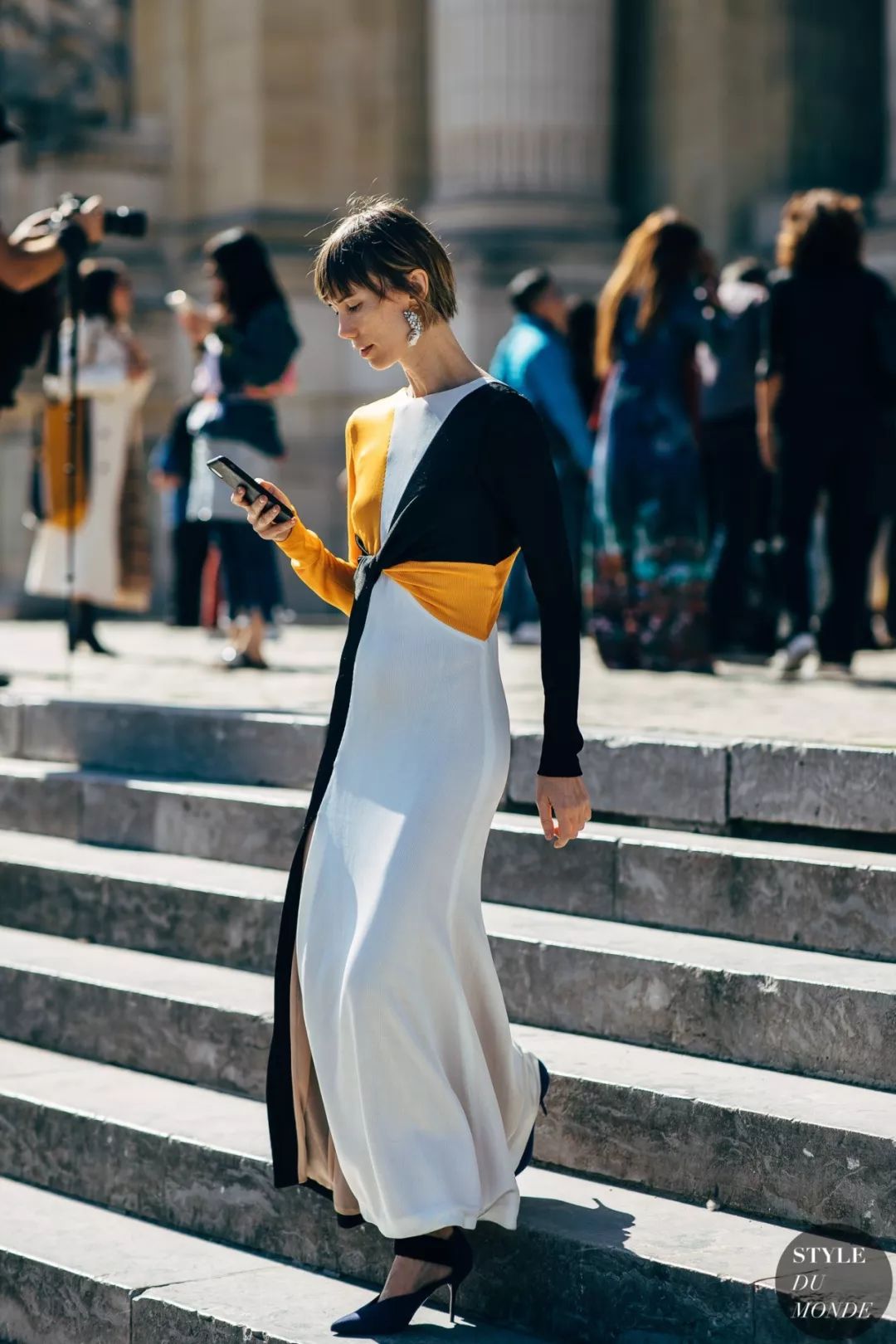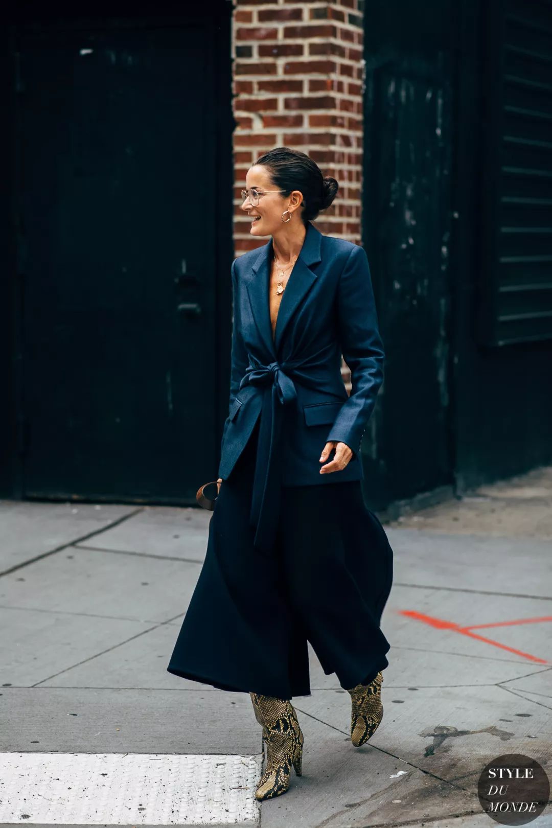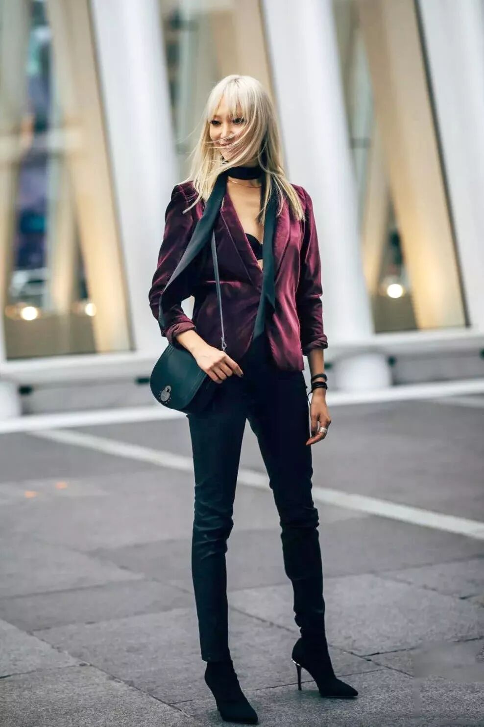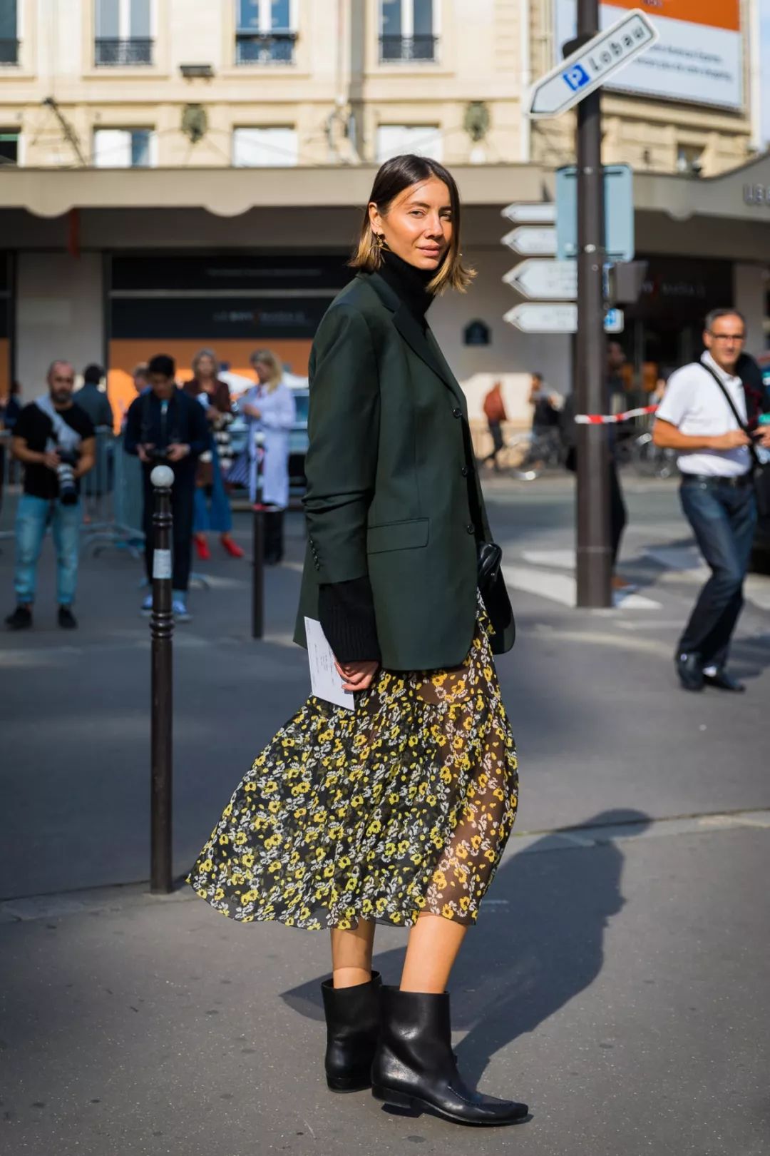 要是能从裤子开始收紧,会更显高。或者穿裙子露出脚踝也可以,总之给造型一个尖锐的收尾,就能起到拉长拔高的作用。