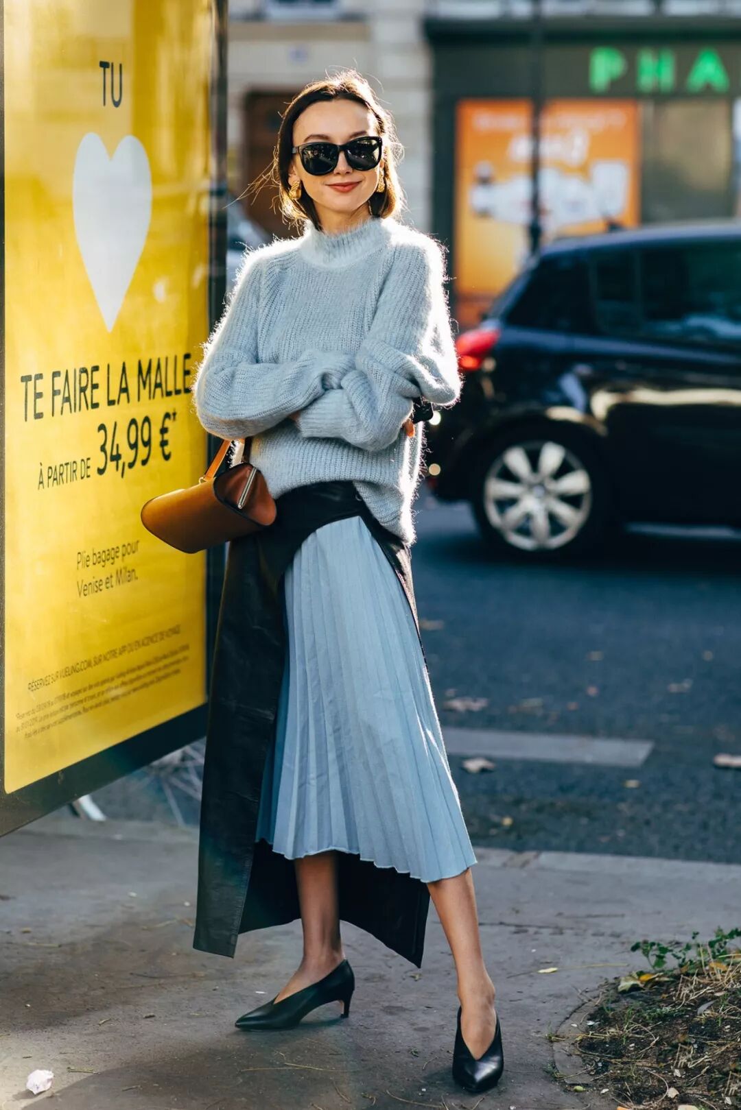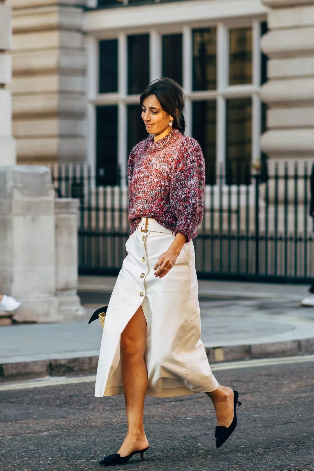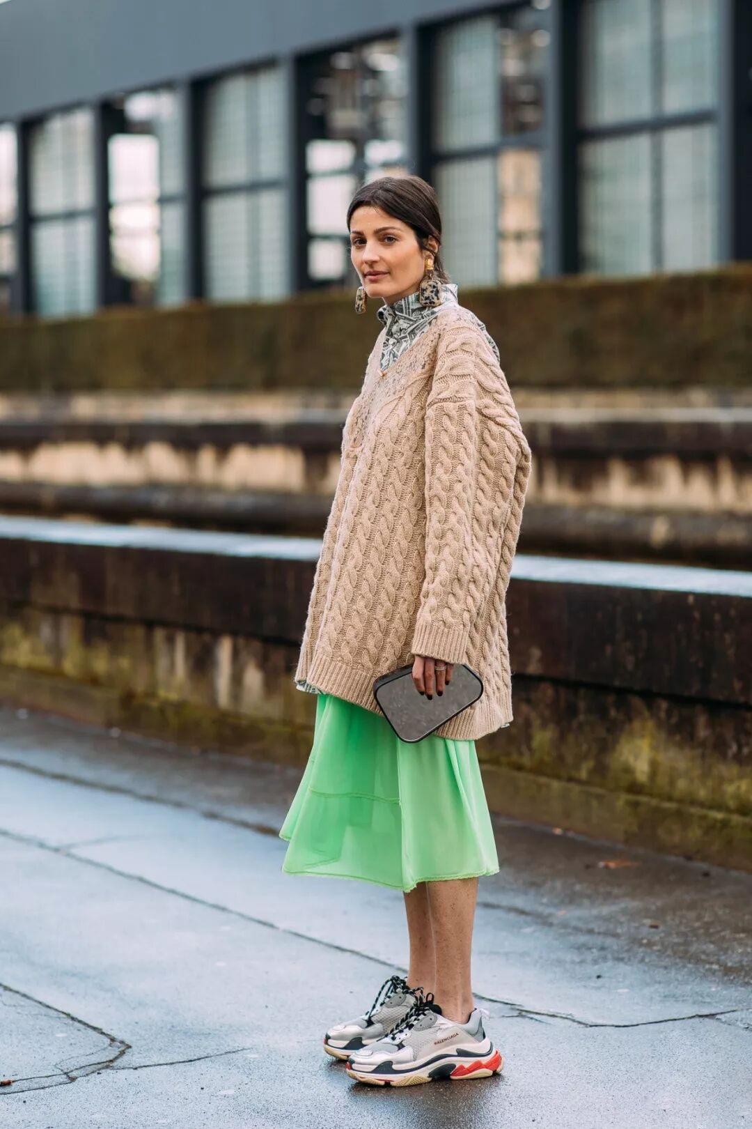 针织毛衣+半裙的搭配比起鞋更应该注意裙长。今年流行的长度在膝盖以下小腿肚之上,也就是俗称的“迷笛裙”。