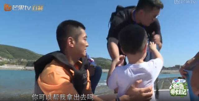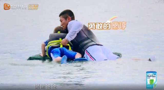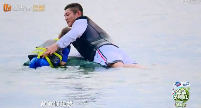玩游戏时掉进水里了,杜江拉他上来,他还要“谢谢爸爸”。