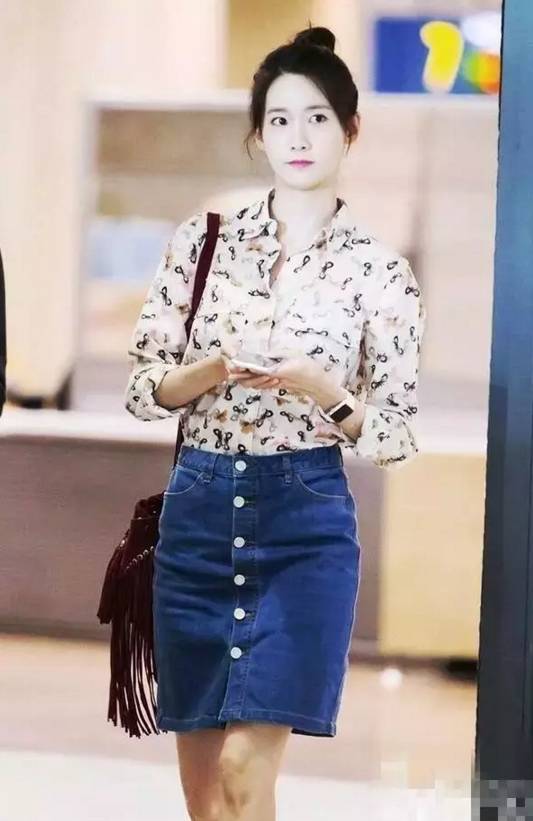 衬衫+牛仔短裙,搭配自己喜欢的丸子头,突然觉得很甜美