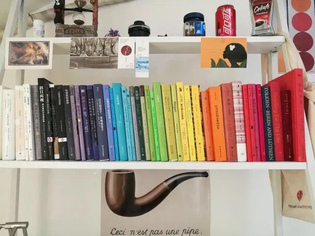 △ 排列图书的方式有很多种,色彩排列法是我偏爱的一种。因为这些书就是我生命里唯一的彩虹。