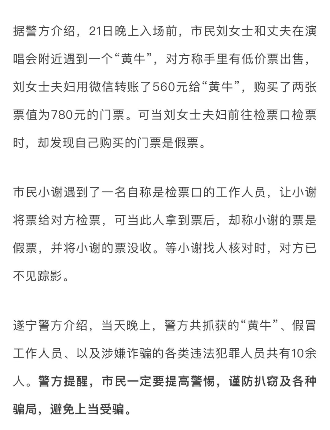 9月22日,记者从遂宁警方获悉,9月21日晚张学友在遂宁的第一场演唱会,遂宁警方抓获扒窃、卖假票、冒充工作人员骗钱骗票等涉嫌违法犯罪人员10余名。
