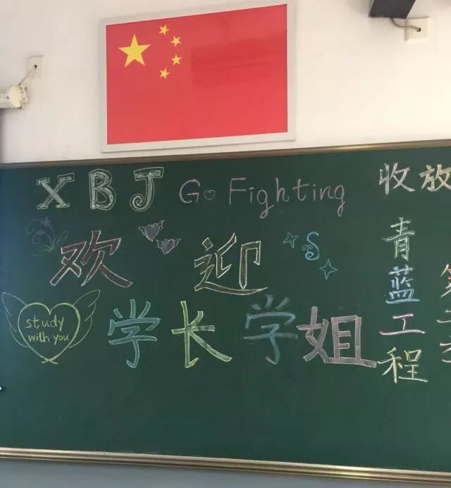 为了欢迎初三(八)班的学长学姐们,我们宣传小组的成员特意在黑板上布置了精美的板报。瞧!