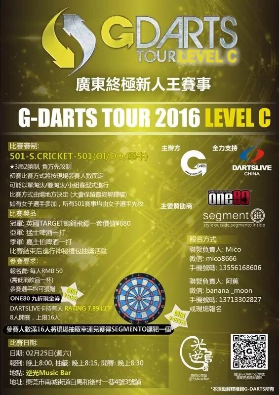 G-DARTS TOUR 2016 LEVEL C 广东终极新人王赛事将在逆光音乐酒馆举行!