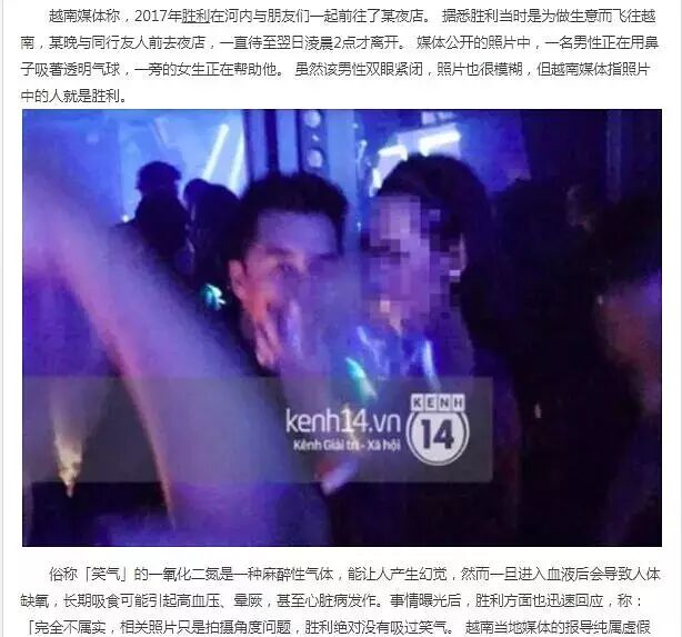 2月27日,越南媒体加入爆料大军,放出了李胜利之前在越南夜店吸食“笑气”的照片,表示李胜利曾接触过这种新型的软性毒品。