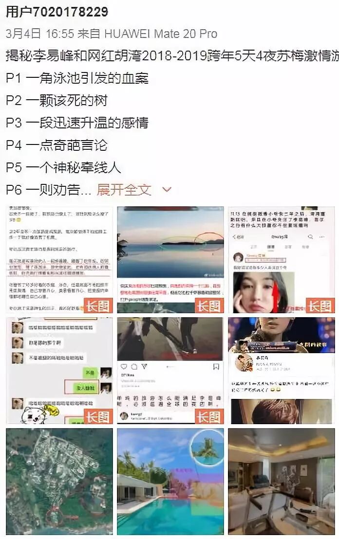 3月5日,安生了一段时间的娱乐圈忽然爆出新瓜,一个名叫“用户7020172089”的微博账户发长文表示,说李易峰和一个叫湾湾的网红在一起了——