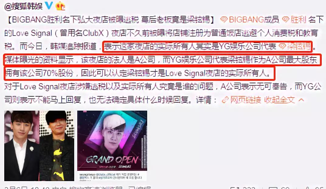 3月6日,胜利名下的另外一家夜店Love Signal同样被爆出偷税漏税,而这次,牵出了李胜利所在经纪公司的老板梁铉锡——