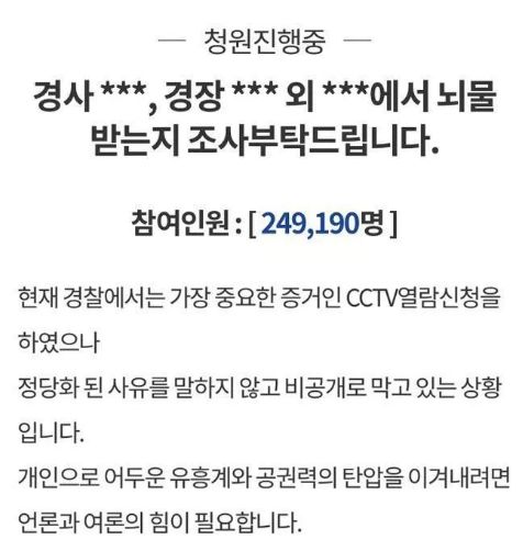 没多久,就有超过20万人在青瓦台请愿,要求彻查此事,申请调查警方到底是不是收了Burning Sun方面的贿赂。