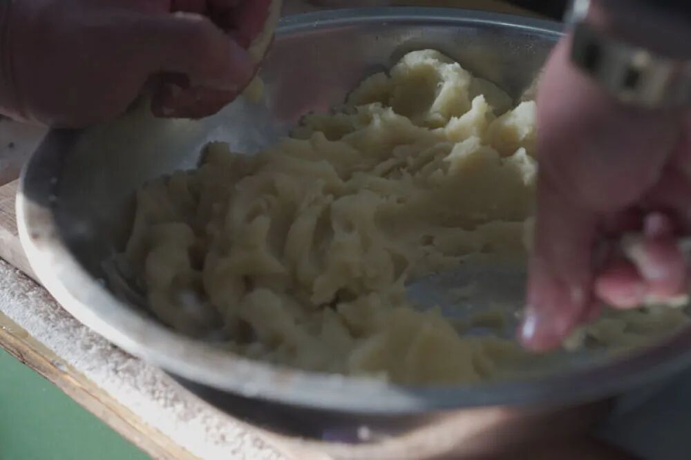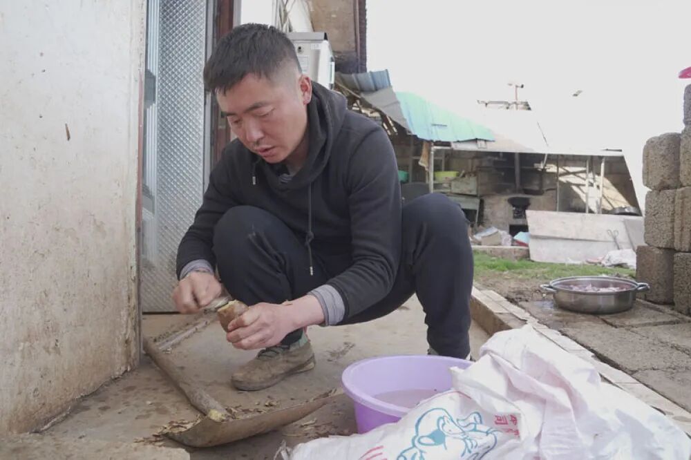 ↑3月10日,在四川省凉山彝族自治州美姑县瓦古乡,彭杨将土豆削皮煮熟后,压制成土豆泥。