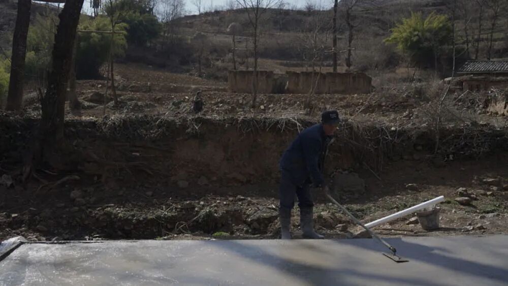↑3月10日,在四川省凉山彝族自治州美姑县瓦古乡,工人在进行通组路面硬化施工。