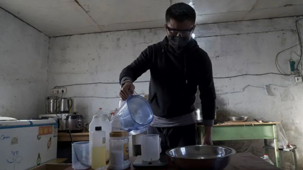 ↑3月10日,在四川省凉山彝族自治州美姑县瓦古乡,彭杨在厨房里制作皂液。
