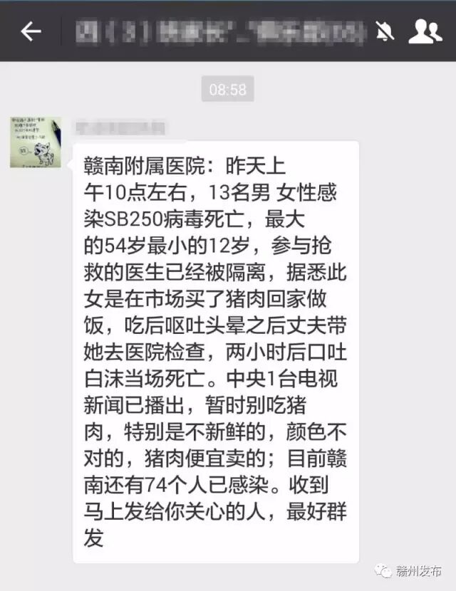 赣南附属医院:昨天上午10点左右,13名男 女性感染SB250病毒死亡,最大的54岁最小的12岁,参与抢救的医生已经被隔离,据悉此女是在市场买了猪肉回家做饭,吃后呕吐头晕之后丈夫带她去医院检查,两小时后口吐白沫当场死亡。中央1台电视新闻已播出,暂时别吃猪肉,特别是不新鲜的,颜色不对的,猪肉便宜卖的;目前赣南还有74个人已感染。收到马上发给你关心的人,最好群发。