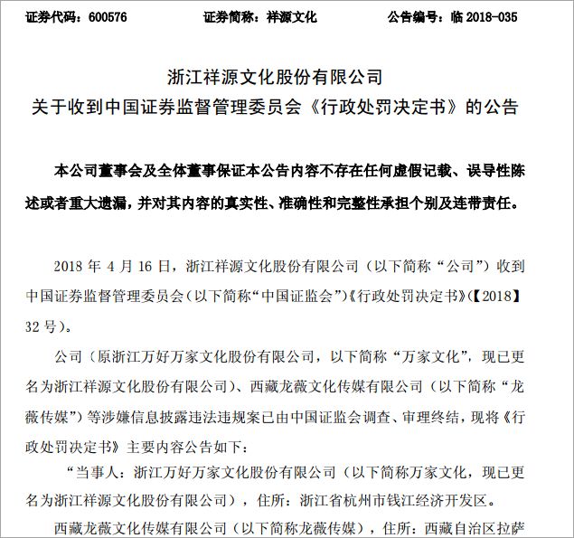 证监会发布《行政处罚决定》,对万家文化和龙薇传媒责令改正,给予警告,并对相关人士采取禁入措施。