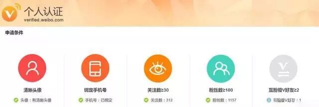 前三项好说,主要是后两项,身边凑够100个人关注自己,难度指数3颗星,花点时间求互粉也可以。就是橙V好友大于2难倒了一大片人,在某宝上,求人认证要花费100起步。一些玩技术的,通过帮人认证都发了小财。微博卡了一堆普通大众不能认证。