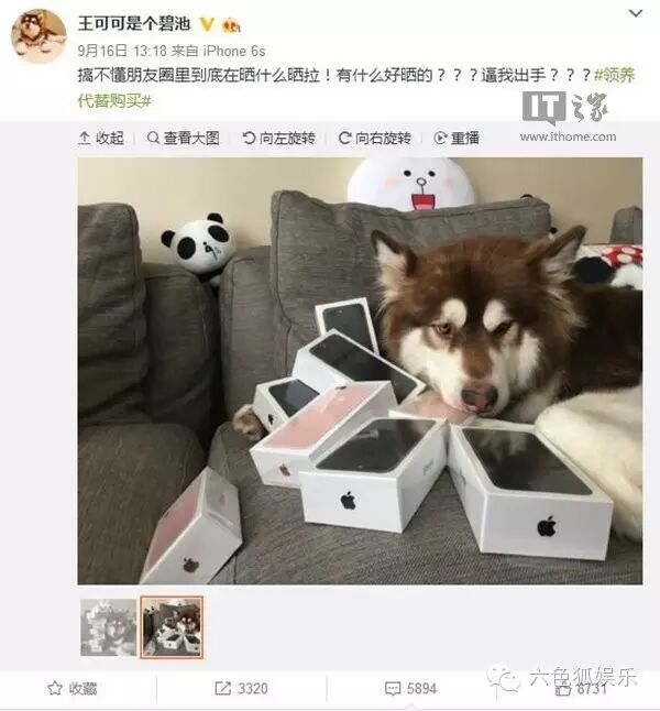 iPhone7开售之际,依旧高昂的价格让很多网友大喊“肾好疼”,王思聪则又通过自己的狗炫耀了一把,一口气为其狗买了8台iPhone7,瞬间引爆网友围观,有网友吐槽这年头活的还不如条狗。