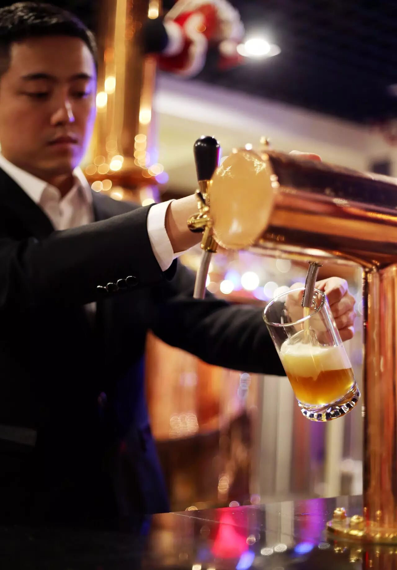 位于酒店二层的黎明啤酒坊, 将最纯正的德国现酿鲜啤和最经典的音乐完美融合,用创意的手法演绎着德式啤酒产生的过程,把传统的酿酒工艺融入到现代酿酒技术中,奉献给食客们最美妙的味觉之旅。