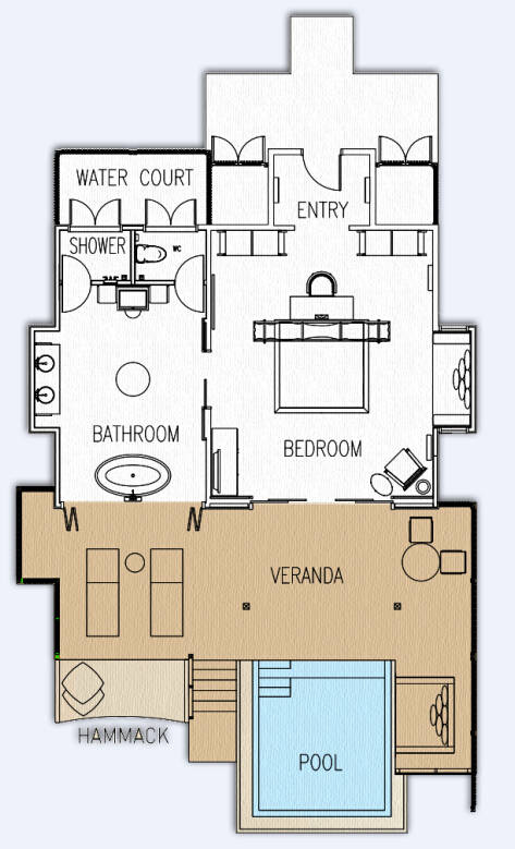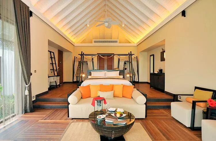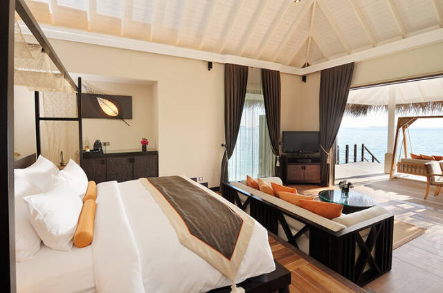 套房伫立在海滩之上,户外水上阳台附设特别入口,可以从海滩和海边进出套房。起居空间与卧室合二为一,空间更开扬宽敞,偌大的阳台设有马尔代夫摇椅和直达泻湖的通道,幽静写意。