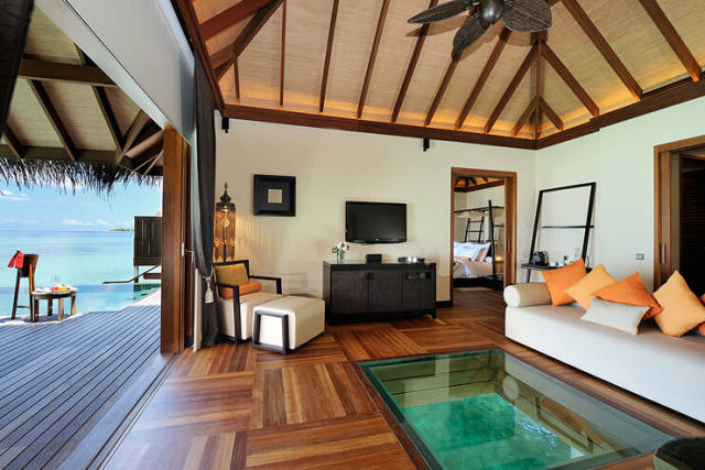 套房建于水上,设有一间卧室,玻璃地板起居室,额外浴室,备餐间,户外阳台,日光浴场连水上吊床,以及和直达泻湖的通道,印度洋的慑人美景尽览无遗。