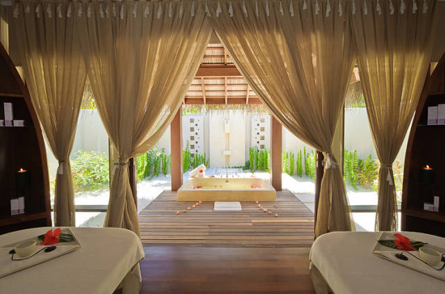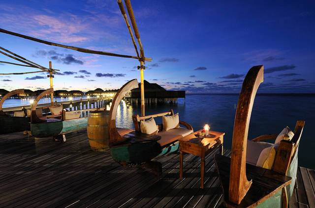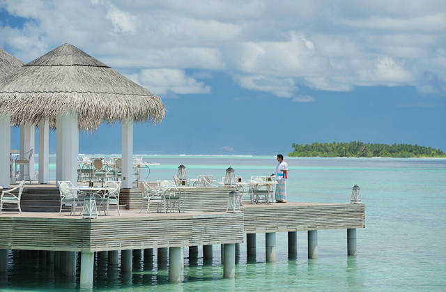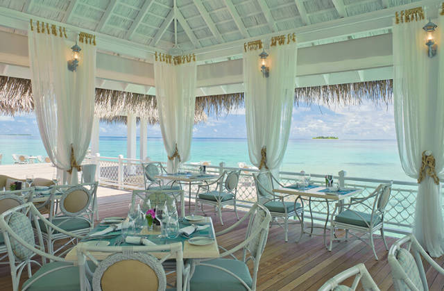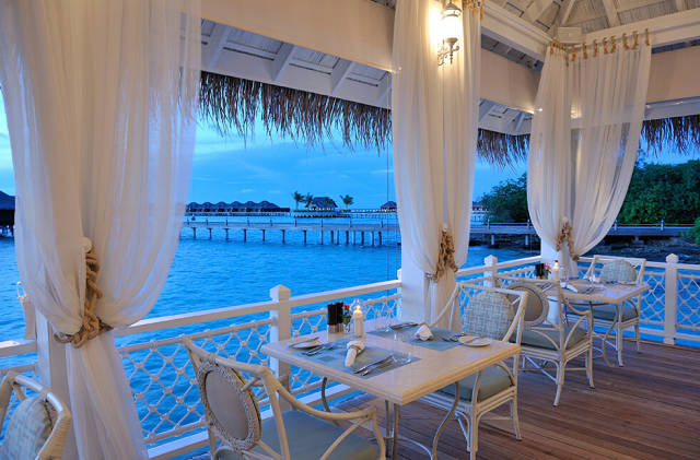 位于海景别墅之间的水上餐厅 ile de joie 供应优质美酒和寿司,各国顶级巧克力和各式顶级雪茄。餐厅分为露天或室内酒吧区,明澄如镜的泻湖环抱,缔造独一无二的餐饮体验。还会提供奢饰品和特色海鲜项目,例如鱼子酱,牡蛎和蛤等等