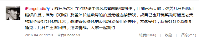 不过今日冯绍峰工作室发布声明,称冯先生确实在拍戏途中遇风浪颠簸轻微扭伤,但目前已无大碍,休养几日后即可继续拍摄。