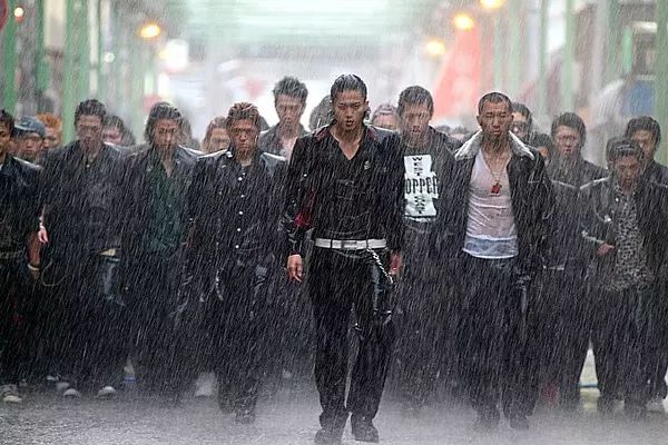 比如他们穿的那个黑色外套,浑似日本电影《热血高校》里的校服。管春带着一堆马仔去饼屋见毛毛,出场画面和《热血高校》简直一毛一样。