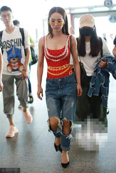 拥有百变天后美誉的蔡依林每次亮相机场都不走寻常路,用亮片和尼制的布料交错混搭,在配上厚底高跟鞋,大秀香肩,还露出肚脐,看得人意犹未尽的!