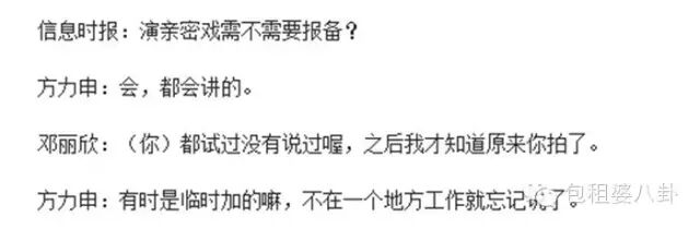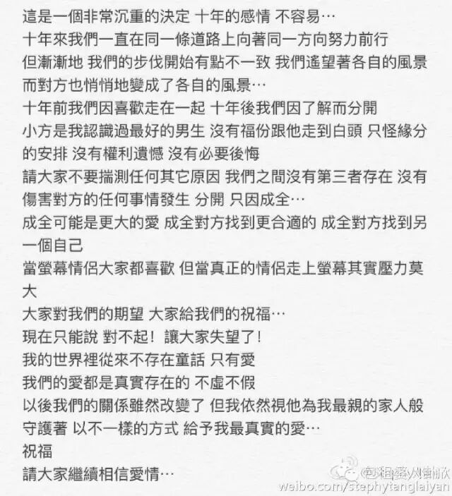公司发声明之后,下午2点多的时候,邓丽欣也发了篇声明,说:我们十年前因为喜欢走在一起,十年后我们因了解而分开(真是熟悉的说法,Selina离婚的时候也说过类似的话,后台回复 Selina 即可看到全文 )。小方是我认识过最好的男生,我们之间没有第三者存在,分开,只因成全…