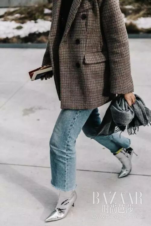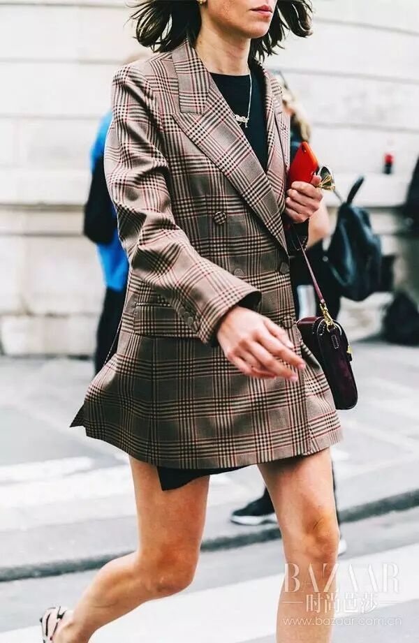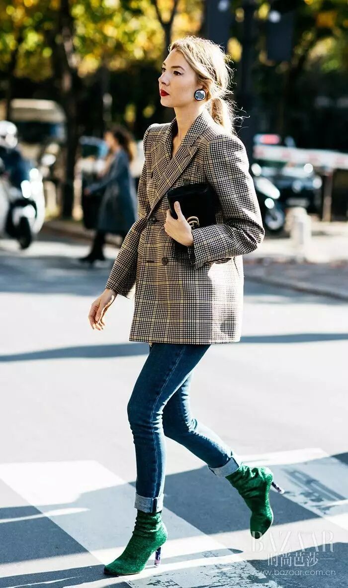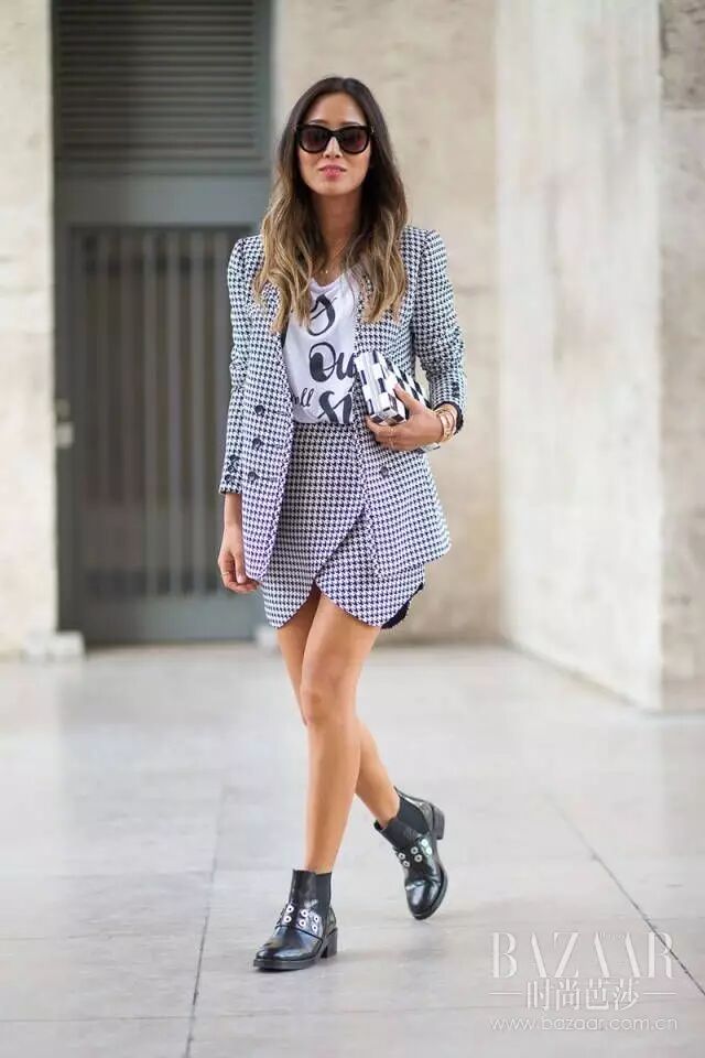 早就说过今年的时髦元素,格子绝对是一大亮点,格子西装外套搭配同样格子款式的半裙。金属色猫跟鞋也是点睛之笔!