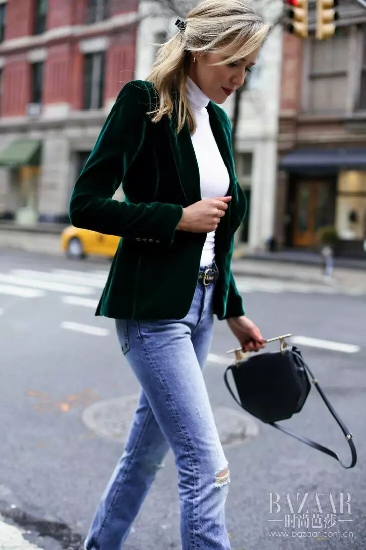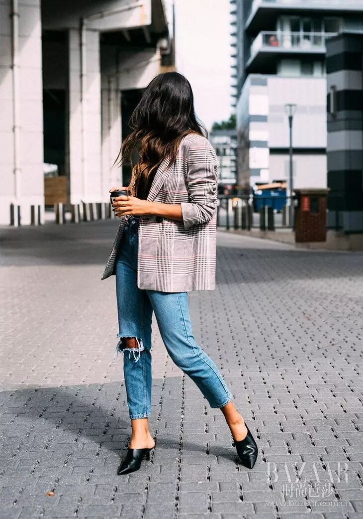 牛仔单品给人的印象总是逃不脱日常舒适。用它来中和西装外套的刻板,搭配破洞牛仔裤,穆勒鞋非常随意街头~