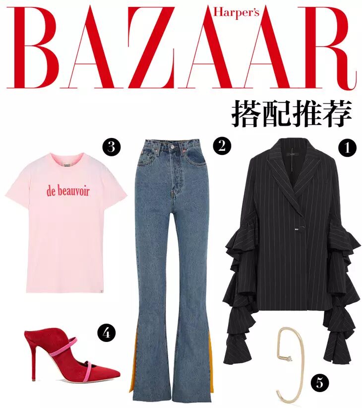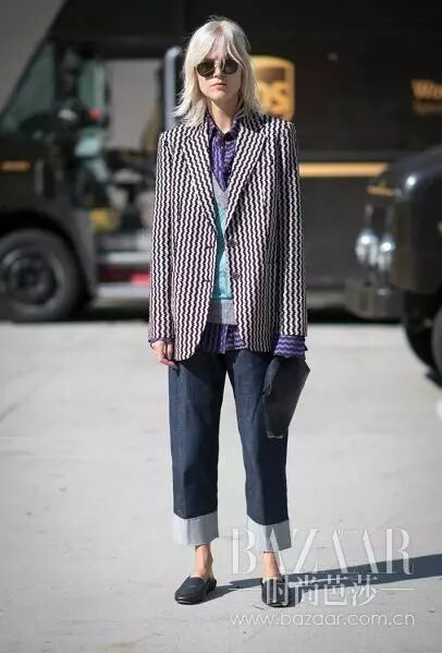 荷叶边装饰显得活泼时髦~ 丝毫不刻板,普普通通的笑脸T恤就把西装外套完美驾驭。