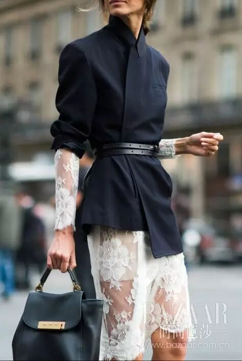 你说西装外套太过刻板,看时尚达人如何玩转它。腰带设计再搭配蕾丝连衣裙~ 解决了你认为西装外套太过强硬的问题。