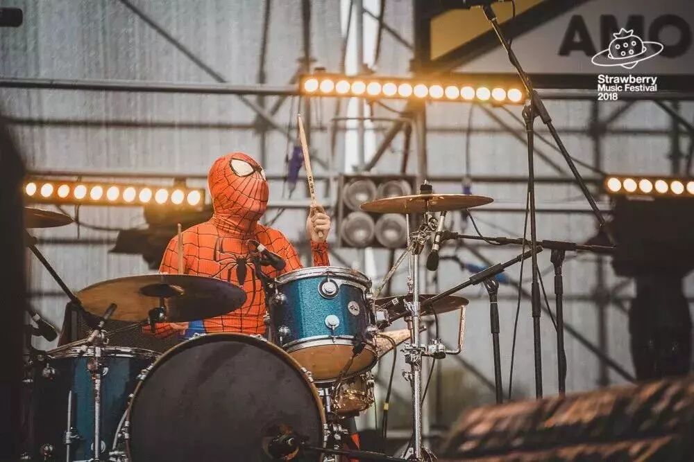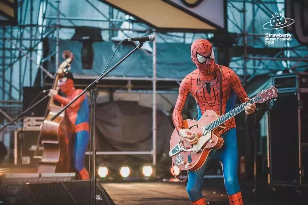 这几天有消息流传:草莓音乐节演出的时候不准歌手露纹身。于是有了这一幕:见过二手玫瑰的妖艳,见过葬尸湖的神秘,也见过神经抵抗的冷酷,像这样cos蜘蛛侠的,还真是前所未闻。这就是杭州草莓演出的旋转保龄乐队整体变成了“蜘蛛侠”。
