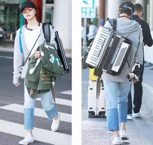 网友爆出这琴有30斤重!果然造作是女明星在机场街拍的基本素质。