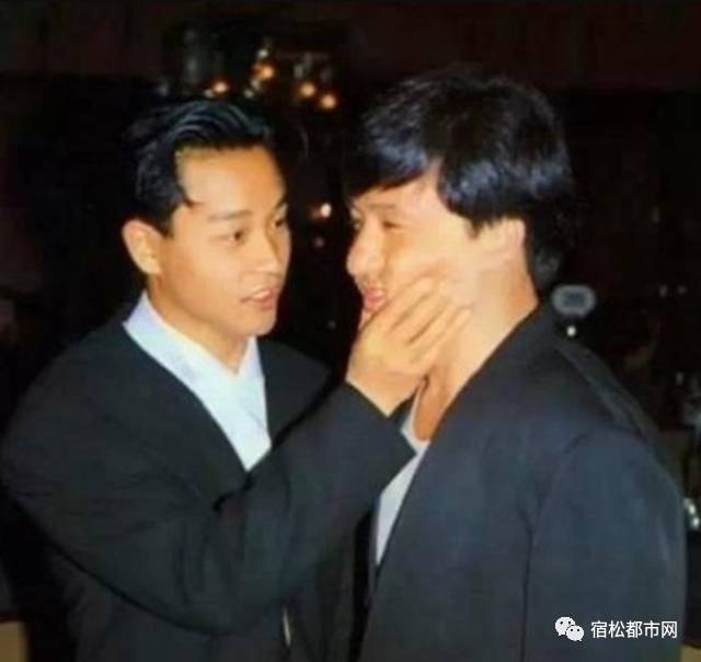 这是张国荣和成龙,看起来两人都是老朋友了,见面可以开这样的玩笑。