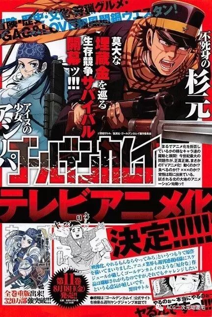 漫画大赏2016冠军作品《 黄金神威 》发表电视动画化消息,单行本总销售量突破320万本!