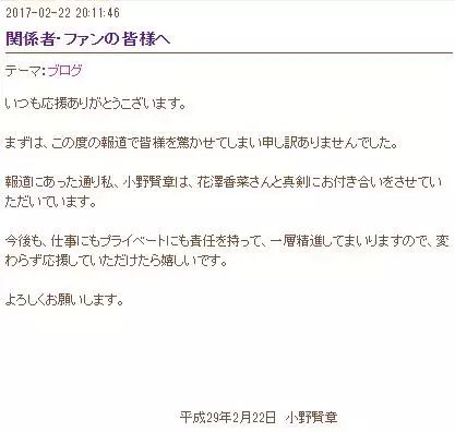 在“文春炮”的攻击曝光后 ,小野贤章已经在Twitter上表态过了,但显然他们并不是特朗普是用TWITTER来治国的。所以花泽香菜和小野贤章也都在昨日分别在直播节目和自己的博客上再度对两人交往一事做出的正式的回应,两人都强调我们是认真交往的(因为都被拍到同居一处了,不说认真感觉两位就是炮友关系了)。