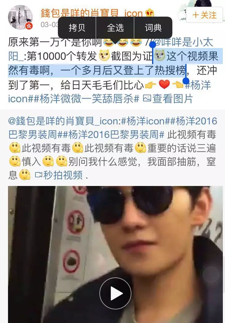 不过小编怀疑这次是杨洋自己公司的炒作,因为视频1月21日就有了,是一个叫@錢包是咩的肖寶貝_icon 的微博网友爆料的(视频里也可以看到),此人微博上全是杨洋的消息,当然也有可能是粉丝,毕竟他自己也说这个视频有毒哈哈啦~~