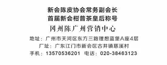 当然,如此辉煌的成就,并非我一人之功,地方政府、各级领导、新会陈皮协会,还有众多有识之仕的大力支持,对新会陈皮文化的重视和热爱,使“新会柑普茶”成长为闻名于世的大品牌,让“新会陈皮”这个老品牌增添光彩!