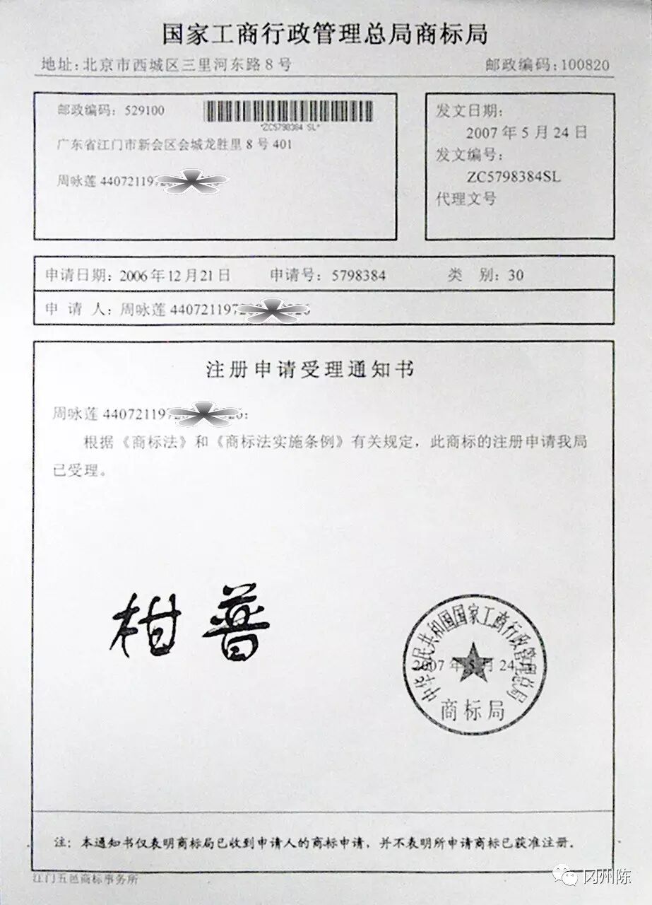 2006年12月21日,我带着产品去了新会工商局。注册品牌时有些意外,事先准备的几个名称经工作人员搜索后都不能注册,于是我说干脆用“柑普”两个字吧,这两个字既体现了新会柑皮和云南普洱的结合,也取意将新会柑发扬光大,普及全国,让世人皆知,意义深远!工商局的工作人员又经过一番搜索分析后,受理了“柑普”的商标注册。接着,又以朋友的名义申请了新会柑普商行的营业执照。