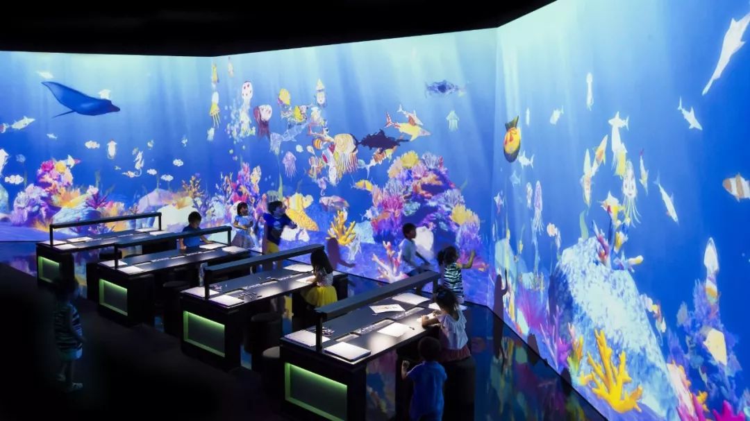 而更有意思的是,观众还可以在现场当一回“神笔马良”,将自己涂鸦的八爪鱼、鲨鱼、小鲸鱼等通过特定的机器扫描,这些涂鸦的生物就会拥有生命,在巨型的虚拟水族箱中自由游弋。你把手放上去或者往水里扔一把虚拟饲料,他们就会向你游来。就会如同被赋予生命一般,在《涂鸦自然》的展场中出现,并且在虚拟的“生态系统”场景中生存繁衍。