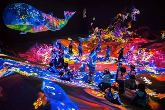 像《涂鸦自然》(Graffiti Nature),作品的面积超过100平方米,动用近20台高清投影、感应等设备,向观众展现一个酷炫瑰丽的大自然。展览现场中,彩绘的巨大鲸鱼在墙上游动,观众走过或者坐下观看,地面就会“生长”出绚烂的植物和花朵。