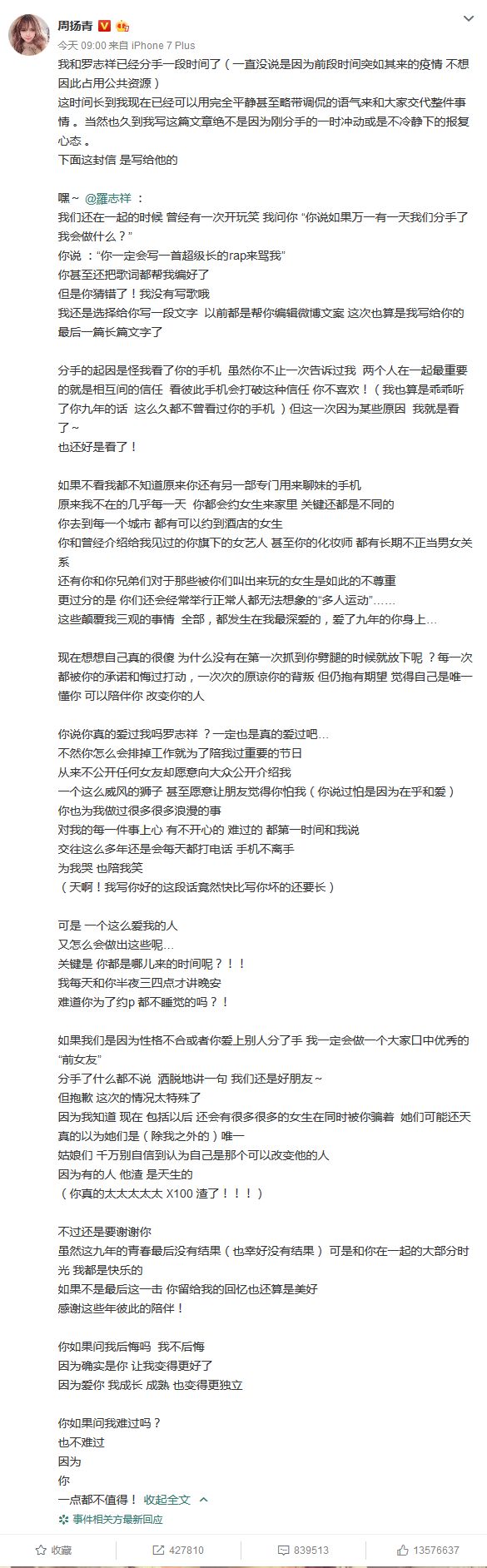 周扬青发长文爆料已与罗志祥分手