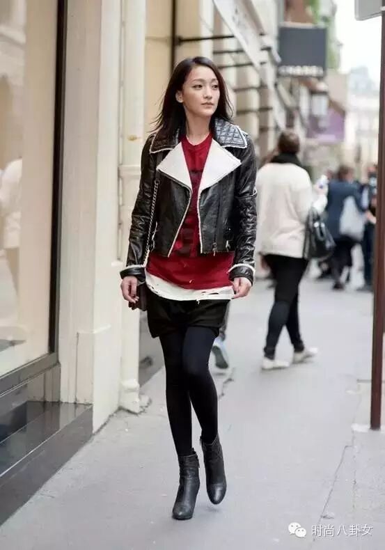 黑白长袖条纹连衣裙,将黑色拼皮大衣搭在身上,尽显活泼俏皮的少女味道,时髦有型,搭配黑色低跟长筒靴,魅力四射。