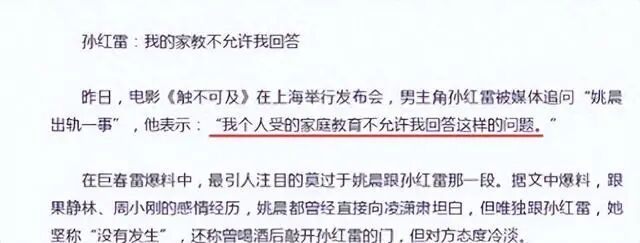 而在绯闻刚刚发酵时,姚晨便做出了回应,她表示对于那些报道完全是“满纸荒唐,物是人非”,孙红雷也在采访时被问到“姚晨出轨一事”,而他回应道“我个人所受教育不允许我回答这样的问题。”