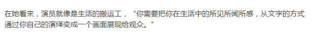 因作品而受到的关注,并未打乱她在演员这条道路上继续前进学习的脚步。正如她在采访中所说的,演员是生活的搬运工,在把积累演变成理论实践的过程中,让她有愉悦感。