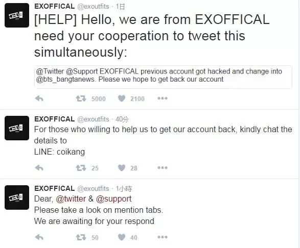 EXOFFICAL目前正积极请求推特帮忙,希望能要回他们原有的粉丝专页,不断PO文希望大家帮忙一起想办法,许多粉丝见状纷纷加入救援行列,希望能帮他们一起救回属于他们6年来的回忆。