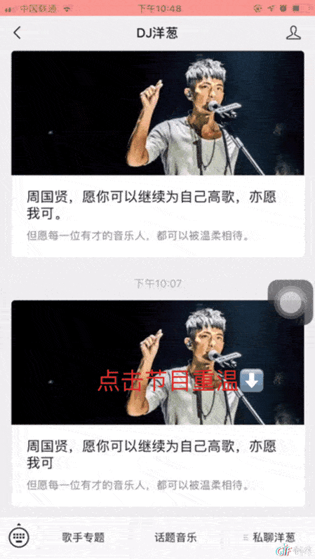 重温节目,可以点击右下角私聊洋葱,然后选择节目重温。在顶部就可以搜索你喜爱的歌手名字啦~↓